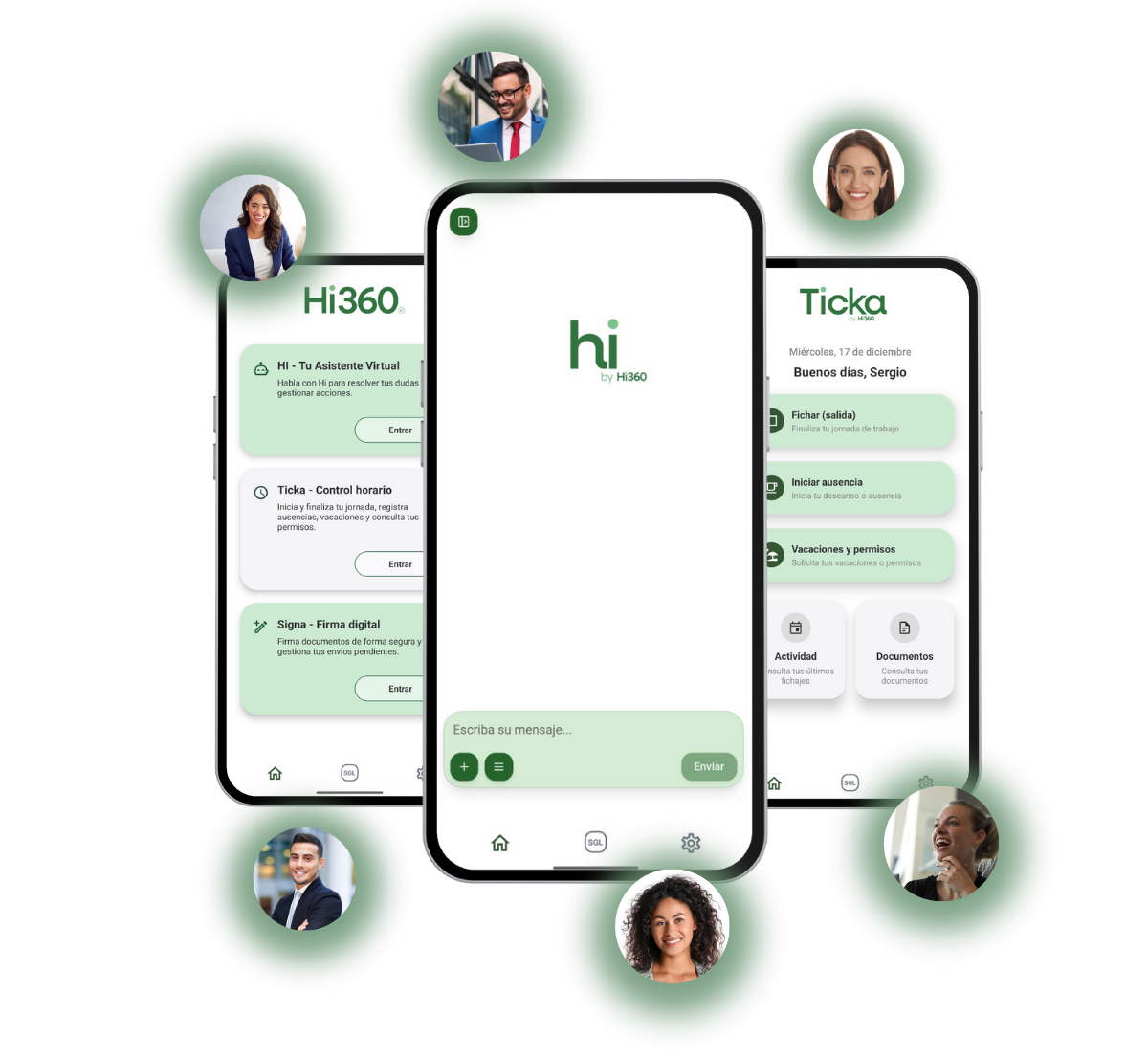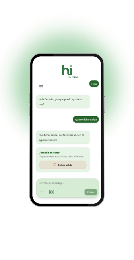 Cada empleado ficha desde su móvil u ordenador y pueden preguntar directamente al Asistente HI cualquier duda habitual: Horarios, permisos, vacaciones, convenio, normas internas. Todo queda registrado según la ley.